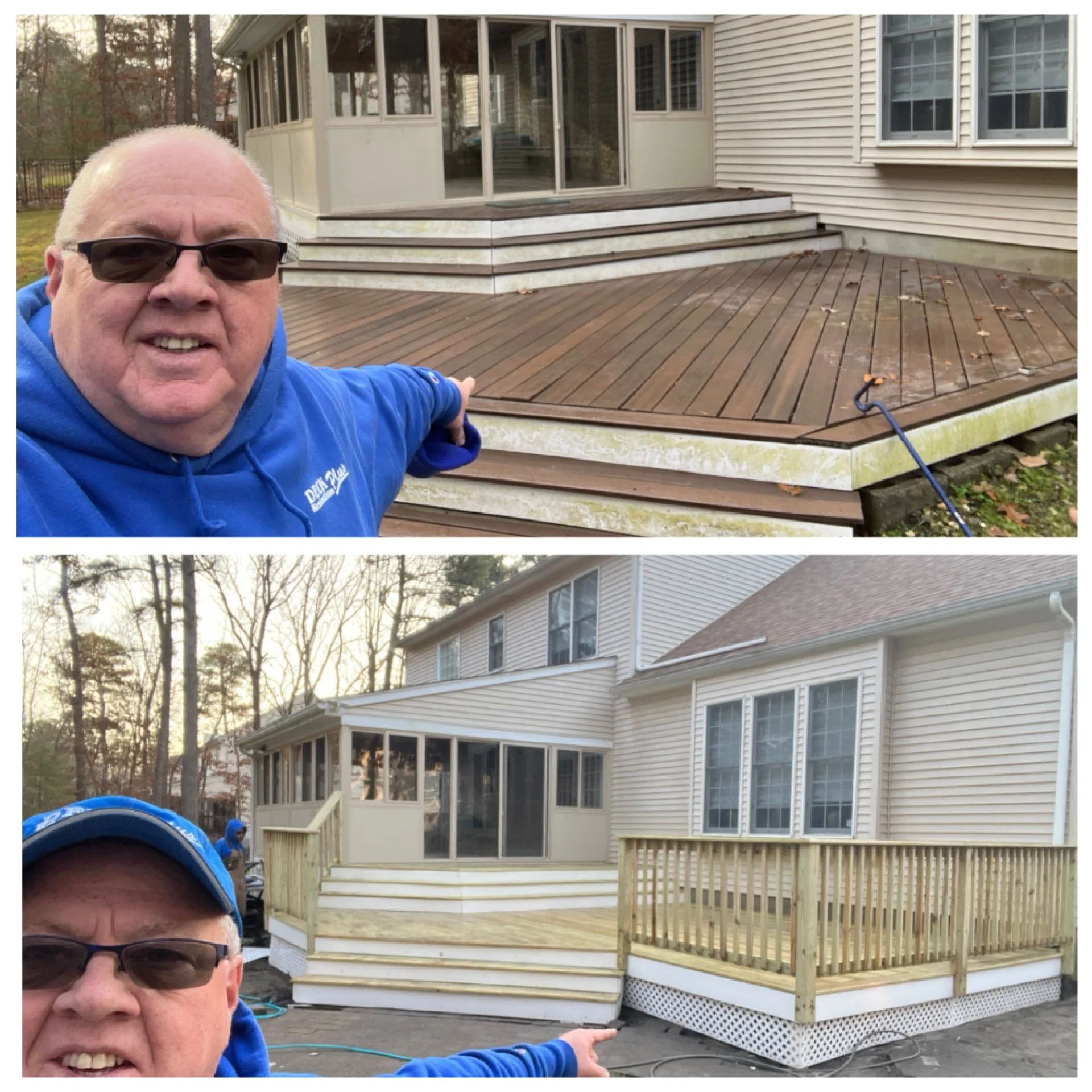 DRP Enterprises does quality work and provides services that other companies can’t compete with! We can extend the length of your deck, build pergolas, inlays, specialty railing, lighted post caps, step risers, add a second story deck and bring all sorts of other creative visions to life! Take a look at this deck the DRP Enterprises team worked on in Medford, NJ where we demo’d the existing composite deck and replaced it with a wooden deck, extending it so it reached the edge of the house.